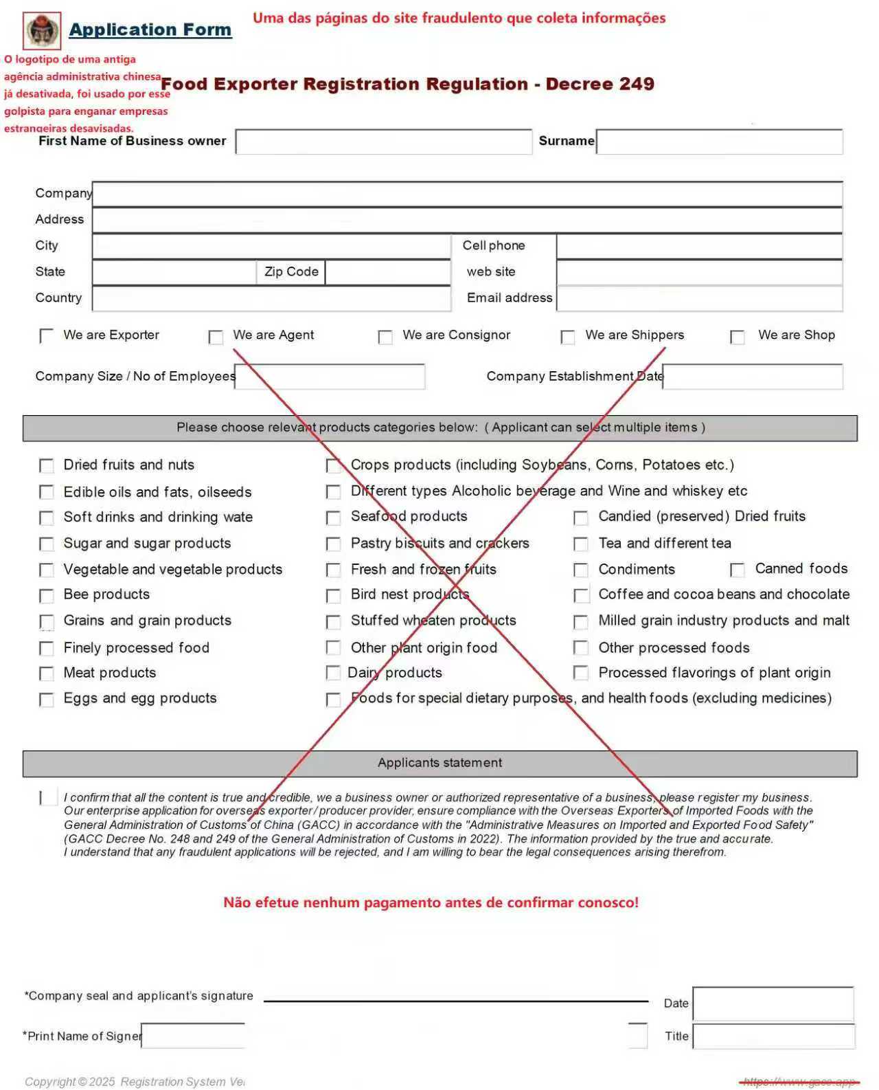 A seguir está um aviso emitido pelo site oficial da Alfândega da China intitulado "Declaração sobre cuidado com sites de registro falsos":
